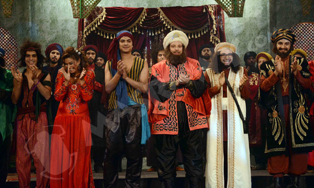 بمجرد أن تظلم الشاشة تضاء الخشبة على كل من النابغة الذبياني والأصمعي وأبي الفرج الأصفهاني وعدد 3 كمبارس، يبدأ الجميع في الغناء بصوت جماعي وببهجة واضحة المقطع التالي: