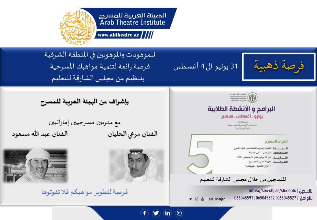 فرصة للراغبين في التدرب على فنون العرائس: ضمن سعي الهيئة العربية للمسرح لتفعيل وتعزيز حضور فنون العرائس وماجاورها في فضاءات الفرجة العربية وتدريب الراغبين من كل الدول العربية وبعد نجاح البرنامج التدريبي في الدورة الماضية والذي استهدف متدربين من (سوريا، لبنان، الأردن، فلسطين، مصر، السودان، ليبيا، الجزائر، المغرب وموريتانيا) تفتح المجال للمتدربين الراغبين من (العراق، السعودية، الكويت، قطر، البحرين، سلطنة عمان، اليمن والإمارات) للترشح للبرنامج التدريبي المقبل ضمن فعاليات الملتقى العربي لفنون العرائس (الدورة الرابعة) في الشارقة خلال الفترة من 11-19/4 /2016 حيث تقام ورش متعددة ومتنوعة.