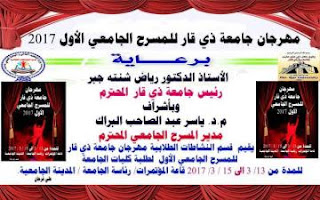 ت الطلابية بجامعة ذي قار الأستاذ المساعد الدكتور ربيع لفتة داخل ” ان الجامعة ستقيم مهرجانها المسرحي الأول لطلبة كليات الجامعة في الثالث عشر من شهر آذار المقبل ولمدة يومين ، برعاية الأستاذ الدكتور رياض شنتة جبر وإشراف مدير المسرح الجامعي الدكتور ياسر البراك .
