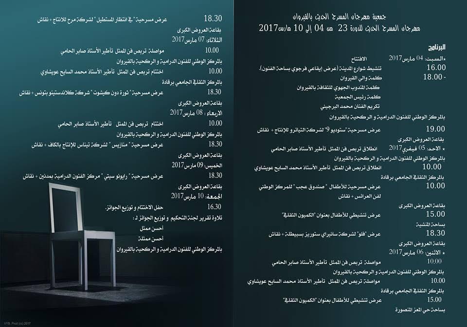 منذ اليوم الرابع من شهر مارس/آذار حتى حدود اليوم العاشر، تشهد محافظة القيروان فعاليات الدورة الثالثة والعشرين من مهرجان المسرح الحديث، الذي يحتضنه المركب الثقافي أسد بن الفرات، وتنظمه جمعية المسرح الحديث بالتعاون مع المركز الوطني للفنون الدرامية والركحية والمندوبية الجهوية للثقافة. ويشهد المهرجان فعاليات مختلفة ومتنوعة، تراوحت بين عروض الشارع والورشات التكوينية والعروض المسرحية التي يواكبها الجمهور من حيث الفرجة والنقاش، كما إنّه معظم أنشطته لم تكتف بالقاعات المغلقة وإنّما شهدت انفتاحا على الساحات العامّة، ما خوّل لها جماهيرية كبيرة جهلت منه يأخذ طابعا احتفاليا في المدينة.
