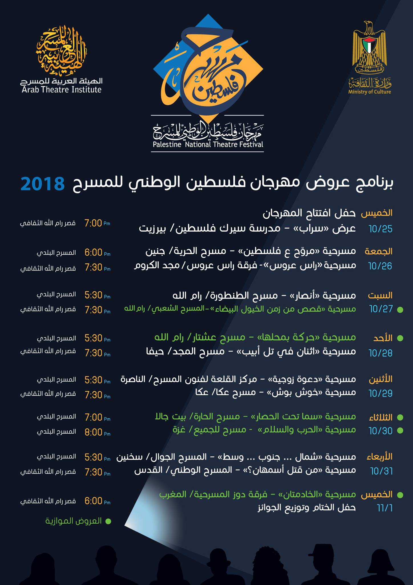 وتنظم وزارة الثقافة الفلسطينية المهرجان بالشراكة مع الهيئة العربية للمسرح في الفترة من 25 أكتوبر/تشرين الأول إلى الأول من نوفمبر تشرين الثاني.