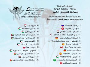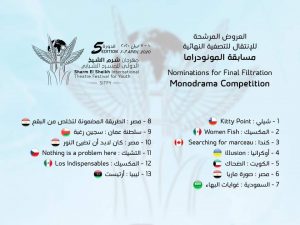 وتواصل حاليا لجنة المشاهدة بالمهرجان أعمالها لتختار القائمة النهائية والتي تتكون من المخرجة كريمة بديروالفنان طارق صبري والمخرج سامح مجاهد والدكتور ياسرعلام والسينوغرافي محمود صبري ومن العروض المختارة في التصفية الحالية في مسابقة العروض الكبري من مصر عروض ( انتظار ) و( اغنية الموت ) و( القطة العميا ) و ( نزهة في ارض المعركة ) و(حذاء مثقوب تحت المطر ) .