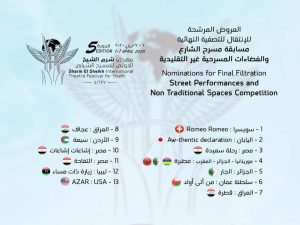 يدخل 80 عرضا مسرحيا التصفية النهائية لاختيار المسرحيات التي ستشارك في الدورة المقبلة من مهرجان شرم الشيخ الدولي للمسرح الشبابي برئاسة الفنان مازن الغرباوي فقد تقدم حوالي 350 عرضا تم تصفيتها من قبل لجنة المشاهدة إلي 80 عرضا متقدمة من دول أجنبية وعربية وعروض مصرية وصلت لـ 36 عرضا لتشارك القائمة المختارة من تلك العروض في ثلاث مسابقات بالدورة الخامسة من عمر المهرجان الذي سينطلق يوم 1 ابريل ويستمر حتي 7 من نفس الشهر بمدينة السلام ” شرم الشيخ ” بمحافظة جنوب سيناء .