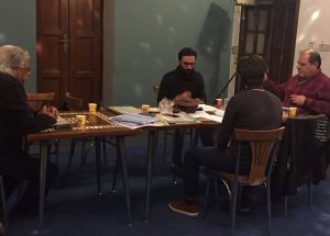 الناقد صميم حسب الله دخل التجربة مع جواد قبل الجميع فاتفقا على أن يكون مساعداً للمخرج فكان عوناً حقيقياً لنا جميعاً فكان جواد يوكل له مهمة التمرين الثاني أي بعد أن ينتهي جواد من التمرين مع حيدر جمعة وأمير يكمل صميم معهم ليكون سنداً حقيقاً لتعاليم المخرج اضافة لعينه المراقبة الحادة وعقله الراجح في تفسير النص واكتشاف مواطن الغموض فيه ، كنا نخوض نقاشات واسعة في الأيام الأولى لتذليل العقبات التي تساعدنا على فهم النص ومضغه خاصة ونحن ندرك جميهاً أننا نرتقي بالنقد فكانت الطاولة تتسيد حوارتنا المثقفة وحتى خلافاتنا في وجهات النظر التي تستقيم بعد الروح النقدية والتي دائماً يستمع لها المخرج بشجاعة وعقل راسخ وهذا ماحصل مع صانع الضوء علي السوداني الذي بدأ يشرح مفهومه للضوء فمازحه جواد لاتشرح ياعلي ارني مقترحاتك وسأقول لك ماأريد وبخفة العارف وقف علي على الخشبة وهو يؤثثها بضوئه المبهر وحين استمع الى ملاحظات المخرج وفهمه درجة حساسيته للضوء كان العرض مبهراً بالضوء وقدم فضاءاً متقدماً . لايمكنني أن أنسى مدير المسرح ( بهاء خيون ) وهو يتحرك بهدوء الأنبياء ليعيننا في البروفة وخلف الكواليس طيلة أيام العرض ، آه لقد إنتهى العرض وبقيت اسرار البروفة تطوف حولنا مثل أم لاتقبل مفارقة أولادها .