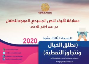 تنظم الهيئة العربية للمسرح النسخة الثالثة عشرة من مسابقة تأليف النص المسرحي الموجه للكبار (فوق سن 18) للعام 2020 حيث يتعين أن تحفر هذه النصوص في الحاضر والمُعَاش، مؤكدة على الدور الإيجابي للإنسان في إحداث التقدم والتغيير؛ وذلك وفق الشروط التالية وبالنسبة لمسابقة الأطفال ان تكون النصوص متفاعلة مع الحاضر خاصة الاجتماعي وتفتح أفق المستقبل، نصوص تساهم في بناء شخصية الطفل من خلال نماذج درامية إيجابية لشخصية الطفل في النصوص المؤلفة؛ موجهة للفئة العمرية من سن 6 إلى 18 سنة، ضمن الشروط التالية:
