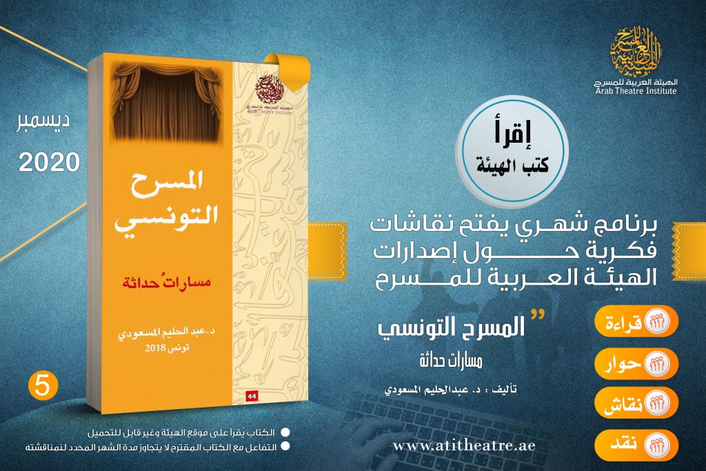 {إقرأ كتب الهيئة} برنامج شهري يفتح نقاشات فكرية حول إصدارات الهيئة العربية للمسرح كتاب شهر أكتوبر 2020 “المسرح التونسي.. مساراتُ حداثة” د.عبد الحليم المسعودي