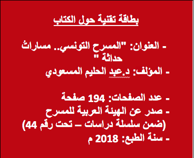 كتاب شهر (أكتوبر 2020) تحت عنوان “”المسرح التونسي.. مساراتُ حداثة “ تأليف المسرحي الباحث د.عبد الحليم المسعودي، والصادر عن الهيئة العربية للمسرح في الشارقة (2018).