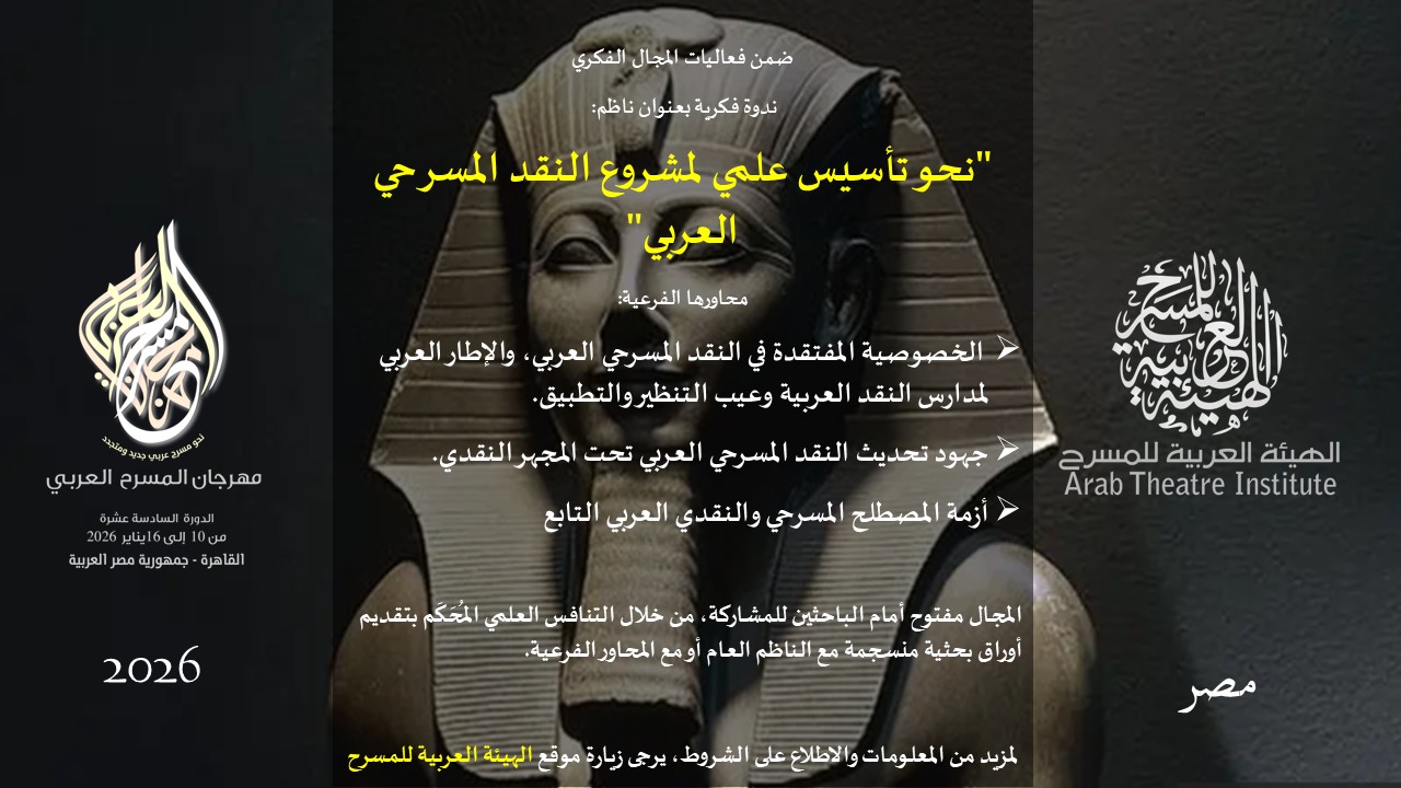 تنفيذاً للتوجهات العلمية الخاصة بالمجال الفكري الذي تنظمه الهيئة العربية للمسرح في إطار الدورة 16 من مهرجان المسرح العربي الذي تنظمه الهيئة العربية للمسرح بالتعاون مع وزارة الثقافة في جمهورية مصر العربية، من 10 إلى 16 يناير 2026، وبموافقة من اللجنة التنسيقية للمهرجان، تفتح الهيئة العربية للمسرح المجال أمام الباحثين من كافة الأعمار للمشاركة في أعمال المؤتمر، من خلال التنافس العلمي بتقديم أوراق بحثية منسجمة مع الناظم العام للندوة “نحو تأسيس علمي لمشروع النقد المسرحي العربي” أو منسجمة مع المحاور الفرعية التي حددتها الهيئة على النحو التالي:
